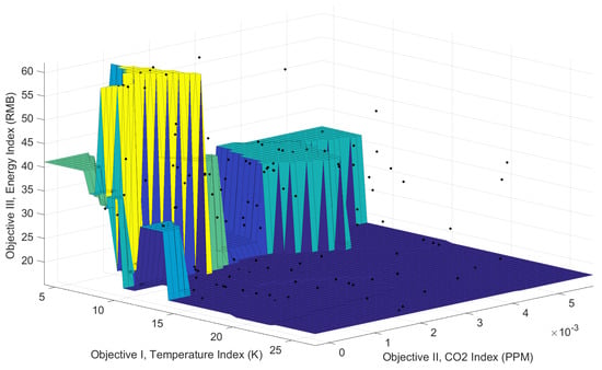 By narrowing down the scope appropriately, we also fit an optimal surface using nearest neighbor method [], which is shown in Figure 11. In this figure, we can roughly observe the distribution characteristics of the optimal solutions more directly. Basically, as the requirements of environmental indexes (distributions of temperature and in this study) became more stringent, the energy consumption rose sharply, which was consistent with the results of previous studies. If we separately extract temperature and energy cost indexes and plot, they show a significant negative correlation that is shown in Figure 12.