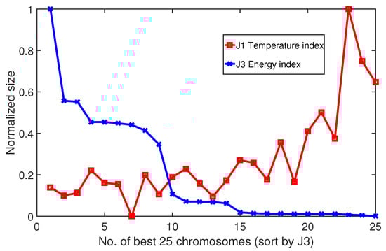 Negative correlation between temperature and energy cost indexes (25 pairs of chromosomes belonging to the Pareto front).
