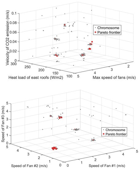 The multiple objective optimization scheme also provide the optimal control variables that are recorded in Figure 13. In total, five different control quantities were divided into two tri-dimensional projections. In the top projection, three main control variables, i.e., heat load of roofs, speed of three fans, and velocity of emission are selected. The variables were clustered in several groups representing different searching orientations of the objective functions. Quantitatively, corresponding to the best 25 solutions, the variation of roofs’ heat load was [154.56, 291.86] (), the variation of fans’ speed is [1.61, 4.63] (m/s), and the variation of emission’s velocity was [0.010, 0.077] (m/s). Note that the maximum speed values of three fans (Fan ) are extracted for this subgraph, and each heat load of the east roofs (Roof ) remains the same in this case study.
