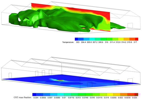 Resulted temperature contour at center Z plane combined with iso-surface of 311 K (top), and fraction distribution at 0.3 m height (Y plane, bottom).