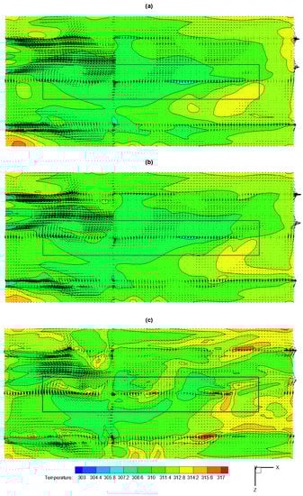 Temperature contours and air velocity vectors at three heights (Y plane): (a) 1.5 m, (b) 1.0 m, (c) 0.3 m.