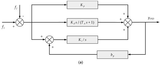 A controller can be classified into many categories, which include the proportional integration (PI) controller, the series PID controller, and the parallel PID controller. According to the performances of robustness and practicability, a parallel PID controller is applied herein. Figure 2a gives the structure of the parallel PID controller, and the transfer function is described by Equation (1).
