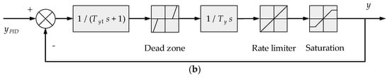 The actuator is the actuating mechanism of the hydraulic turbine governor. Here, the nonlinear characteristics are considered in the model of an electro–hydraulic servo actuator. Figure 2b presents its structure, and the expression of the electro–hydraulic servo actuator is expressed by: