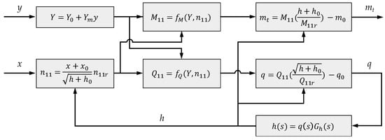 where , , and are the relative deviations of the discharge, torque, head and speed, respectively; , and are unit speed, unit discharge and unit torque, respectively; and are the characteristic functions of unit discharge and torque, respectively; is the guide vane opening; the subscripts ‘r’ and ‘0’ indicates the rated and initial values, respectively; and is the transfer function. Figure 3 shows the mathematical calculation block diagram of the nonlinear hydro-turbine model.