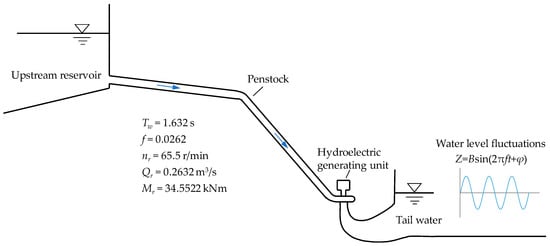 The turbine governing system of a small hydropower station is a complex nonlinear coupling system which mainly undertakes power output modulation and frequency regulation. The start-up process of a small hydroelectric power plant is closely related to the turbine governing system, which is composed of a hydraulic-turbine governor, a hydro-turbine, a generator, and a conduit system (seen in Figure 1) [20,25,26]. In this section, the mathematical model of turbine regulation system is introduced. The boundary conditions of the tail water fluctuation caused by flood discharge are established and analyzed.