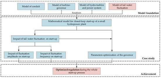 Employing the mathematical model as specified above, the CLCS for starting-up under the tail water fluctuation was simulated based on the technical parameters of the above small hydroelectric power plant. The amplitude and frequency of the tail water fluctuations were the two important factors influencing the start-up process. Therefore, the impacts of fluctuation of amplitude and frequency on start-up were numerically investigated. According to the influence results, the parameters of the governor were optimized to achieve an optimized regulation during the whole start-up process, and the technical route can be seen in Figure 6.