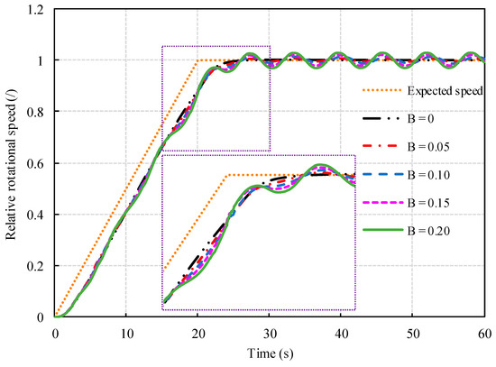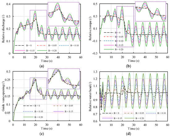 The initial water head was 1.0, and the parameters of the governor were , and . The closed-loop control strategy with a straight-line speed rise curve was adopted during start-up. The tail water fluctuation frequency was fixed at 0.17 Hz. The fluctuation amplitudes of the tail water were found to be 0, 0.05, 0.10, 0.15 and 0.20. Comparisons of the start-up characteristics of the units are presented in Figure 7 and Figure 8.