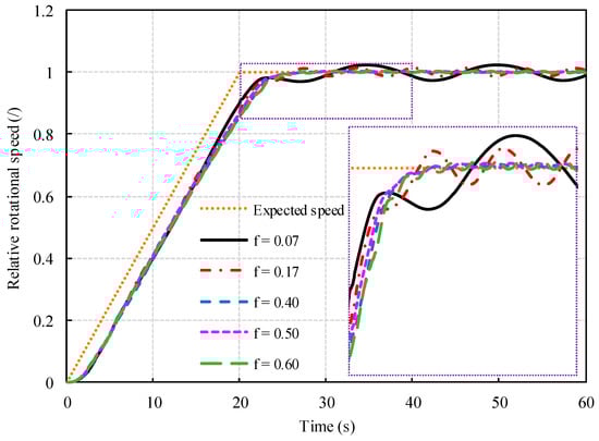 Comparison of closed-loop start-up speed characteristics of different tail water fluctuation frequencies under a fixed fluctuation amplitude.