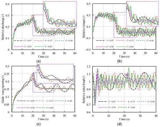 Figure 10 presents the characteristics of other parameters under different fluctuation frequencies for a fixed fluctuation amplitude. As shown in Figure 10, the tail water fluctuation frequency had a greater influence on the demand discharge, turbine rotational torque, guide vane opening and head for the start-up process. Especially if the fluctuation frequency was too small, 0.07 Hz for instance, the guide vane opening greatly fluctuated, making the guide vane swing back and forth. This phenomenon is extremely dangerous and should be avoided.