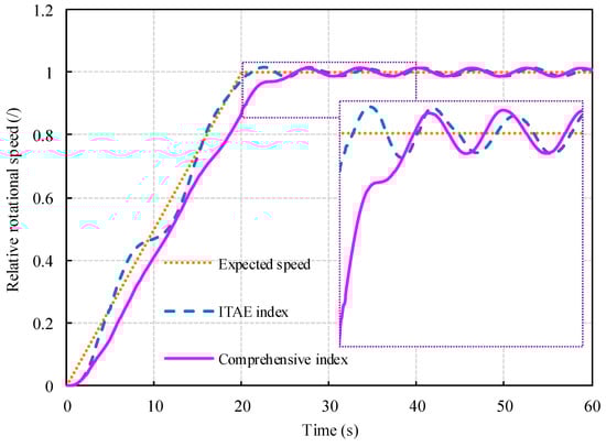 Similarly, the initial water head was 1.0, and the CLCS with a linear speed rise curve was adopted. PSO was employed to optimize the parameters of the governor under tail water fluctuation, and the MOC index was selected as the optimization function. The amplitude and frequencies were 0.1 and 0.17 Hz. In addition, the start-up characteristics of the MOC index were compared with the ITAE index. The contrast curves of the start-up are presented in Figure 11 and Figure 12, and the corresponding PID parameters and performance indices are given in Table 1.