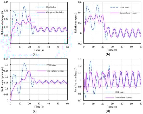 According to the corresponding PID parameters, the performance indices were calculated and are presented in Table 1 and Figure 11. The results indicate that the start-up times for the multi-objective comprehensive index and the ITAE were 23.85 and 19.42 s, respectively. Thus, both of these two indices can ensure start-up rapidity. Additionally, the start-up time of the MOC index was only 4.43 s more than that of the ITAE index. Secondly, the value of the product of time and absolute error was 19.19 under the ITAE index, which was much lower than that of the MOC index—35.80. However, the overshoot, the maximum deviation of water head, and the head deviation integral under the MOC index were smaller than that of the ITAE index, reduced by 9.5%, 33.3% and 5.6%, respectively.