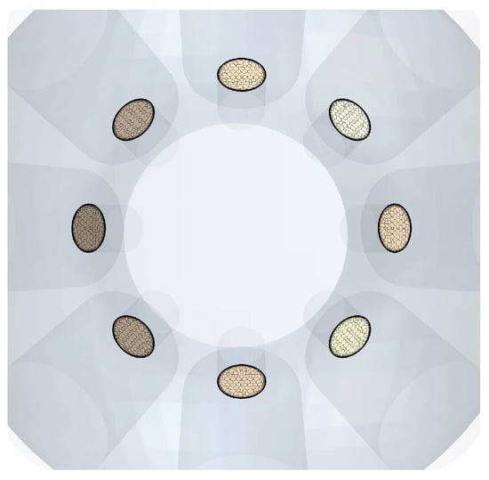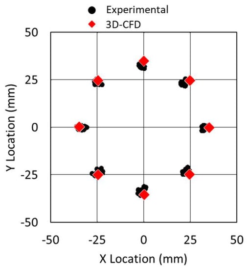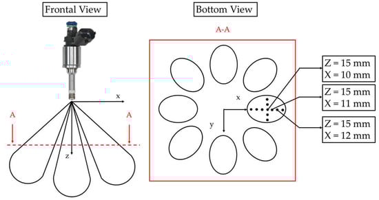 Liquid length, PDA data and hydraulic coefficients are available on the Engine Combustion Network (ECN) website []. As for the coefficients, they are obtained from mass flux and momentum flux measurements carried out at Càtedra Motores Térmicos (CMT) in Valencia []. PDA measurements are available at different locations on a plane 15 mm far from the injector tip, as depicted in Figure 1. For the sake of validity of the experimental data, only three locations are considered for the comparison with numerical outcomes.