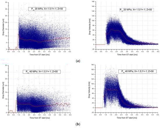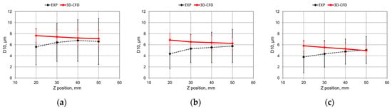 At 30, 40 and 50 mm, experimental mean droplet diameters (D10) and velocities are reasonably matched by numerical results for each analyzed injection pressure. In fact, both experiments and simulations show a decrease of the geometric diameter for increasing injection pressures. It is worthwhile to point out that initial droplet diameters and values measured at 20, 30, 40, and 50 mm away from the tip are very similar, which proves that secondary break-up poorly affects results for the chosen numerical setup in terms of initial diameters.