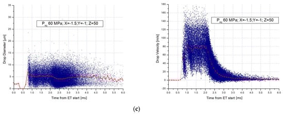 PDA raw data at x = −1.5, y = −1 and z = 50 mm for injection pressures of 20 MPa (a), 40 MPa (b), and 60 MPa (c); Energizing Time (ET) equal to 1.5 ms.