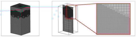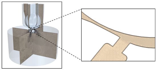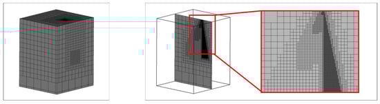 The computational domains consist in block-shaped vessels whose characteristic dimensions are 40 × 40 × 80 mm for the Spray G and 130 × 140 × 180 mm for the 5-hole injector, respectively. Numerical grids depicted in Figure 6 and Figure 7 consist of hexahedral cells and they are characterized by the presence of cone-shaped refinements in the spray core region, whose minimum cell size is equal to 0.4 mm for the Spray G and 0.7 mm for the 5-hole injector []. As known, main spray characteristics such as penetration are deeply affected by the numerical grid size. This is the reason why a grid sensitivity analysis is carried out for both the investigated injectors and minimum cell sizes reported above represent the best trade-off between reasonable computational cost and reduced grid-dependency [].
