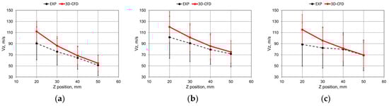 Comparison between numerical and experimental mean velocities. (a) 20 MPa (b) 40 MPa and (c) 60 MPa.