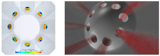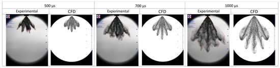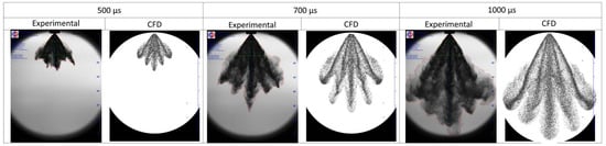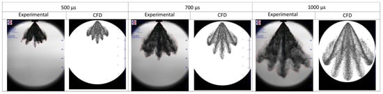 In order to understand the reasons behind such unexpected behavior, a comparison between numerical snapshots and experimental imaging 0.5 ms after the start of injection is shown in Figure 17.