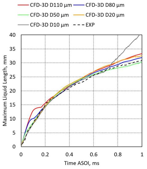 A first numerical-experimental comparison is proposed in Figure 16, which shows liquid penetrations for the different investigated droplet initial diameters. Initial droplet diameter is able to affect liquid penetration both at the beginning and at the end of the injection. In particular, if initial diameter decreases, initial liquid penetration decreases as well, due to a lower droplet momentum. Even if it is not so evident because of the reduced injection duration, moving towards the end of the injection, a more complicated trend can be noticed: starting from 110 µm and reducing droplet diameter, penetration reduces as well. However, moving from 50 µm to 20 µm liquid length increases. Finally, adopting a diameter of 10 µm penetration remarkably increases.