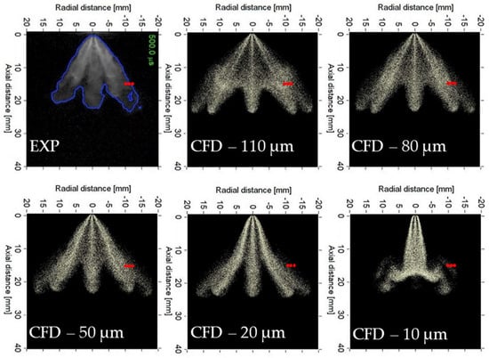 For droplet initial diameters higher than 50 µm, numerical spray closely resembles the actual one. Small differences can be noticed considering the overall cone angle. However, this is mainly due to the fact that numerical images account for all the droplets, even the smallest ones. On the contrary, the experimental acquisition system is characterized by a mass threshold of 1%, so the smallest droplets are excluded. It is useful to note that, not by chance, the collapsing tendency of the spray with small initial diameters closely resembles the behavior of a spray under flash boiling conditions. Under these conditions, which are more and more investigated by experiments, it is widely demonstrated that droplets exiting from the nozzle are characterized by diameters much smaller than those under non-flashing conditions [].