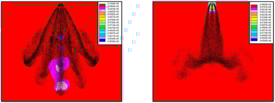 While larger initial droplet diameters lead to a consistent numerical representation of the Spray G, smaller values produce large deviations from the experimental outcomes. Moving from 110 to 10 µm, a collapse of the spray plumes is increasingly evident. Such phenomenon, clearly visible in the case with droplet initial diameter of 10 µm, is the main responsible for the over-penetration in Figure 16 and it is mainly due to the higher back pressure (0.6 MPa) compared to the 5-hole injector operating condition (0.1 MPa). In fact, as visible in Figure 18, with low backpressure (5-hole injector), the pressure difference between the core of the spray and the outer region is almost negligible. Conversely, at higher backpressure (Spray G), the difference is remarkable. Because of the lower pressure in the spray core region, plumes are attracted by each other. Only larger diameters ensure a droplet momentum able to overcome attraction between plumes.
