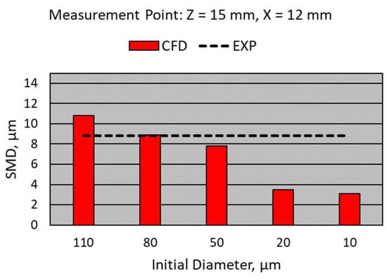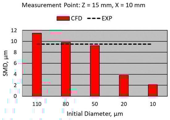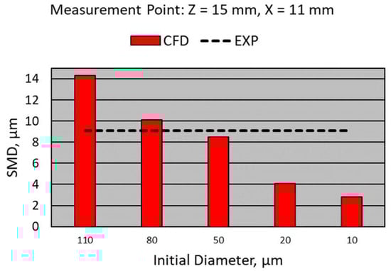 Comparison between numerical and experimental diameters, for different droplet initializations, at an axial distance of 15 mm from the injector tip and a radial one of 10 mm.