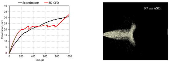 The first comparison between numerical and experimental data deals with liquid penetrations. Comparisons at 20, 40 and 60 MPa are reported in Figure 8, Figure 9 and Figure 10 respectively.