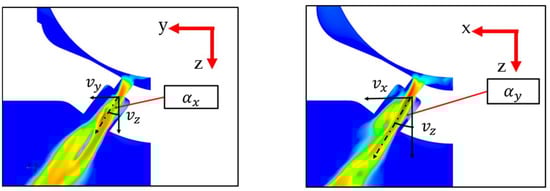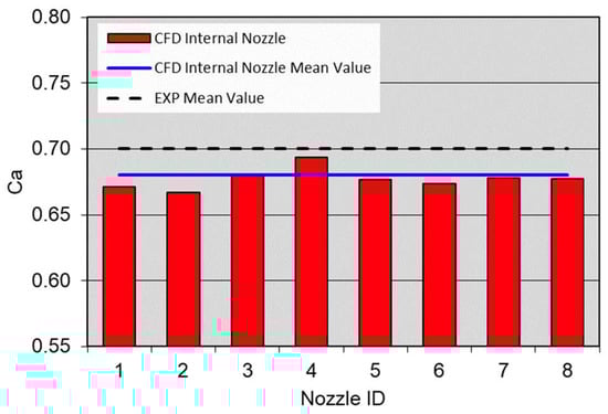 In the light of the promising results obtained with the 5-hole injector, the same numerical approach is adopted for the Spray G. In particular, the initial droplet diameter is set equal to nearly 10 µm, which roughly corresponds to the experimental Sauter Mean Diameter (SMD) measured on a plane 15 mm away from the tip along the injector axis. As for the static initial droplet velocity, compared to the previous case, a more reliable estimation can be obtained thanks to the availability of Cd, Ca and Cv [], which are discharge, contraction and velocity coefficients, respectively, and whose definitions are reported hereafter.