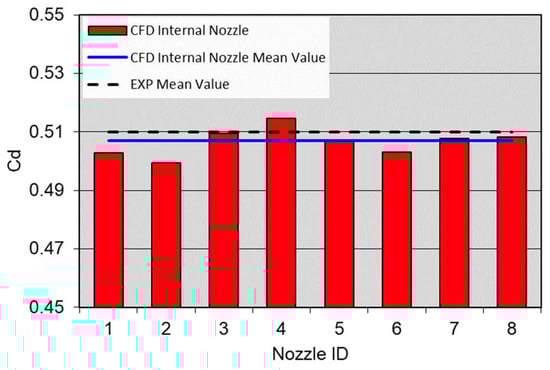 It is useful to point out that numerical spray penetrations are computed as the distance from the injector nozzle outlet section at which 95% of the plume mass is met, consistently with a widely diffused practice []. Moreover, for all the conditions, despite liquid penetration along the injector axis considers the whole spray, it is always determined by the central plume whose axis is almost coincident with the injector one.