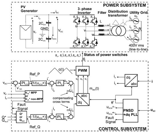 The block diagram of the three-phase grid-connected PV system of this article is shown in Figure 1. The power subsystem encompasses the PV generator, the inverter, the L filter, the transformer and the low-voltage utility grid. From Figure 1, it is worth noting a three-wires system with two degrees of freedom, allowing the decoupled control of P and Q.