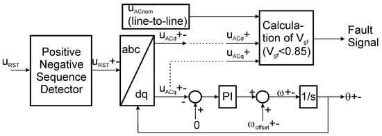 On one hand, the PNSD calculates both the positive- and the negative-sequences of the grid voltages during unbalances [], in order to detect the voltage sags (see Equations (1)–(3)). The quadrature components of the grid voltages uACq+ − are fed to two PI regulators in order to reduce their values to zero producing the positive- and negative-sequences of the angular speeds ω+ − of the grid voltage vector uAC. It is worth noting that initial values of the angular speeds ωoffset+ − are added to reduce the time to track the phase angles, improving the PLL stability. Finally, two integrators compute the phase angle θ+ −, although only the positive-sequence θ+ is feedback to the vector control of the inverter currents, as it is shown in Figure 1. On the other hand, the Fault Signal is activated when the normalized depth of the voltage sag (Vgf) is less than 0.85 (see Equation (6)).