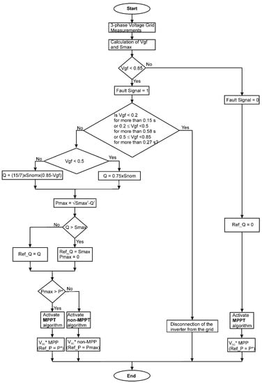 Figure 4 depicts the enhanced flowchart for the implementation of the LVRT capability of the grid-connected inverter during voltage sags for the Spanish case, although it is worth noting that any other international grid code can be valid by using the appropriated voltage profile for the LVRT and changing some values of the parameters in Equation (8) accordingly. The flowchart allows not only the injection of reactive power to the utility grid during faults, but also a certain amount of active power, while not exceeding of the nominal amplitude of the three-phase currents.