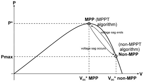 Finally, Figure 5 depicts the operation with MPPT and non-MPPT algorithms for no fault and faulty operations, respectively. It is clear that during the fault the amplitude of the positive-sequence of the grid voltages decreases and the outer DC voltage controller will try to increase the amplitude of the output inverter currents so as to be able to balance the power at the output of the PV generator and the active power delivered to the grid for MPP operation. However, due to the current limitation imposed by the grid code, the non-MPP operation mode is activated and will ensure the correct balance of power when voltage sags occur because the output voltage of the PV generator will move to the right in the PV curve of Figure 5 (from (VDC* MPP, P*) to (VDC* non-MPP, Pmax).