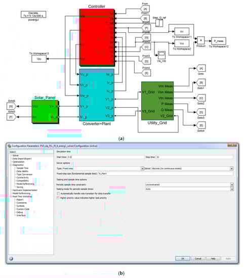 (a) Simulink model of the grid-connected photovoltaic system; (b) solver.
