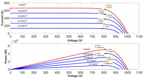 Using a Matlab/SIMULINK PV generator model with the specifications shown in Table 1 and Table 2, several I-V and P-V curves of the PV generator for different irradiances and T = 25 °C are traced as can be seen in Figure 7. These curves are then used to build a Lookup Table (2-D) in SIMULINK [] in order to evaluate the proposed control strategies under several test conditions.