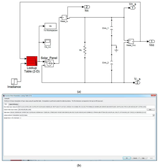 (a) Simulink model of the Solar Panel; (b) Lookup Table (two-dimensional; 2-D) model of the PV generator.