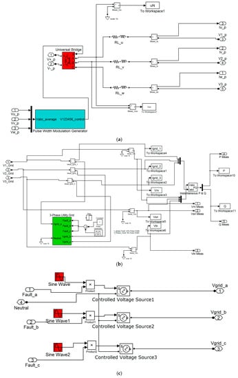 Simulink model of the power subsystem: (a) three-phase inverter + L Filter; (b) faulty grid; (c) three-phase Utility grid.