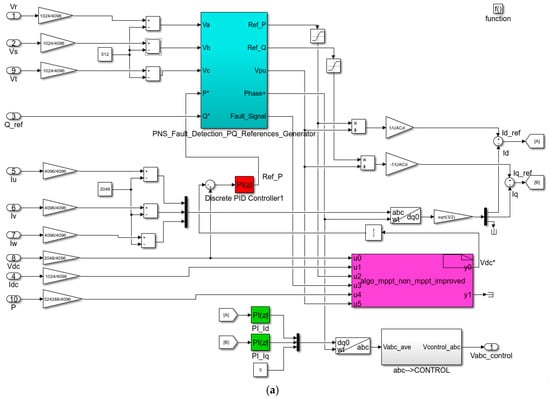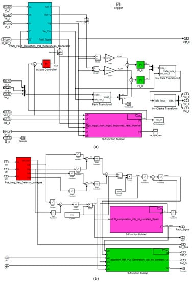 In Figure 10b, the PNS Fault detection + the PQ References Generator are described in detail. The magenta color block calculates the adequate reactive power (Q) according to Equation (8), whereas the green color block calculates the active and reactive power references used in the LVRT algorithm described by the flowchart in Figure 4.