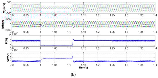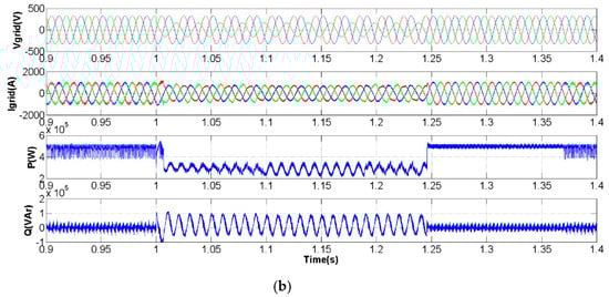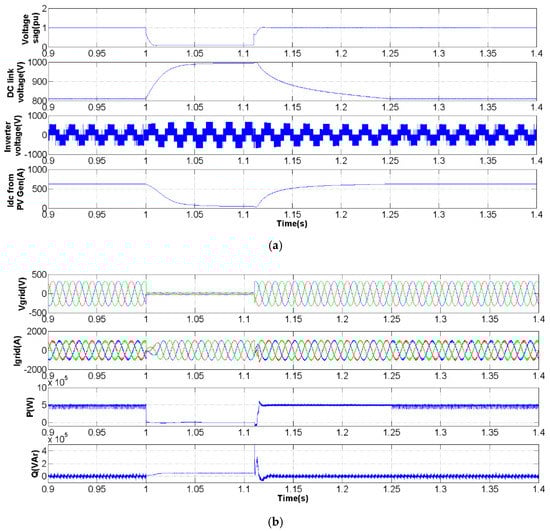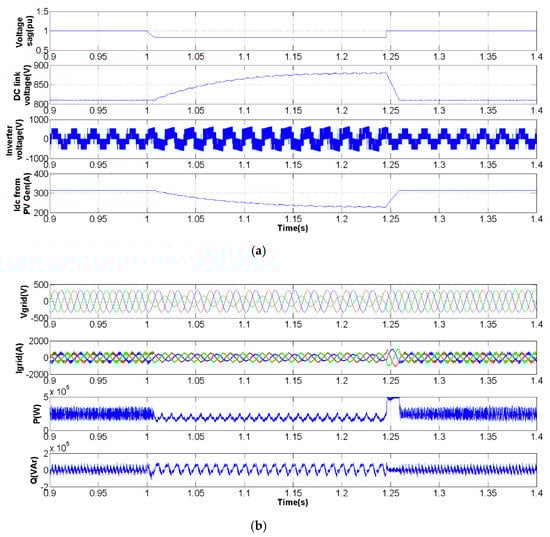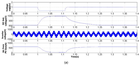 In Figure 11, Figure 12, Figure 13, Figure 14, Figure 15, Figure 16, Figure 17 and Figure 18, the time evolution of the voltage sag (p.u.), the DC link voltage, the inverter voltage, and the DC current delivered by the PV generator, respectively, are depicted in (a); the grid voltage, the grid current, the active and reactive powers, respectively, are depicted in (b). Several types of voltage sags are applied at 1 s for two irradiances G = 1000 and 500 W/m2 and the grid currents indicates no overcurrent during the short-time duration fault events in all cases. When the voltage sag ends, the no faulty operation mode of the PV system is established (P = 500 kW and 250 kW, respectively, and Q = 0).