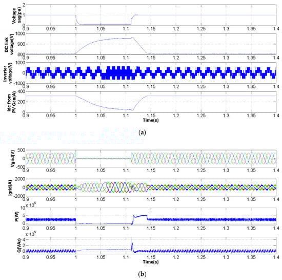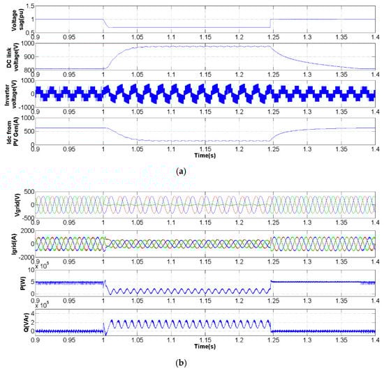 In Figure 23 and Figure 24, some tests are shown to demonstrate the LVRT capability when a three-phase deep voltage sag of 90 and 70% occur at an irradiance G = 500 W/m2. The time evolution of the DC link voltage and the DC current delivered by the PV generator, the grid voltages and currents at the grid side, and P and Q powers delivered to the low-voltage utility grid are shown in (a), meanwhile the same variables are depicted in (b) during the voltage sags, where the values of the nominal period (T = 20 ms) of the voltages and currents, and P and Q powers can be observed for the normal and faulty operation modes.