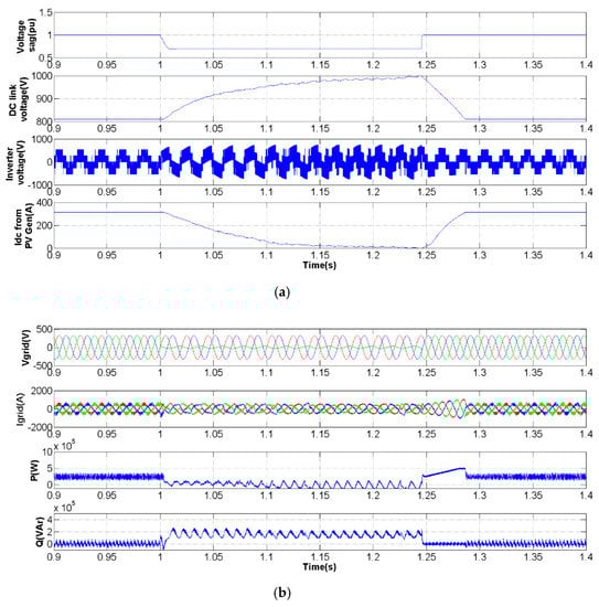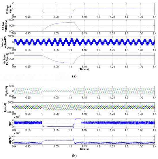 When voltage faults were introduced to the utility grid, the proposed control algorithm of the three-phase single-stage grid connected inverter exerted the proper limitation of the three-phase output currents through the inverter to its nominal values in order to avoid the triggering of its overcurrent protection and the disconnection from the utility grid. Thus, the DC link voltage of the PV generator increases in order to track the new active power and make the power balance; meanwhile, some reactive power is delivered to the grid in order to improve its voltage profile. When voltage sags end, the DC voltage decreases until the maximum power point is tracked for normal operation, whereas the reactive power is set to zero in order to achieve a unity power factor.