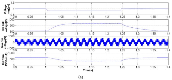 Figure 11 and Figure 12 show the time evolution of the several variables mentioned above when a three-phase deep voltage sag of 90% occurs for irradiances G of 1000 and 500 W/m2, respectively. The DC link voltage increases from 810 to 995 and 954 V, respectively, whereas the DC current delivered by the PV generator is around 50 A for both situations during the fault due to mainly the copper and the inverter losses. The delivered P is zero and Q is 50 kVAr for both irradiances.