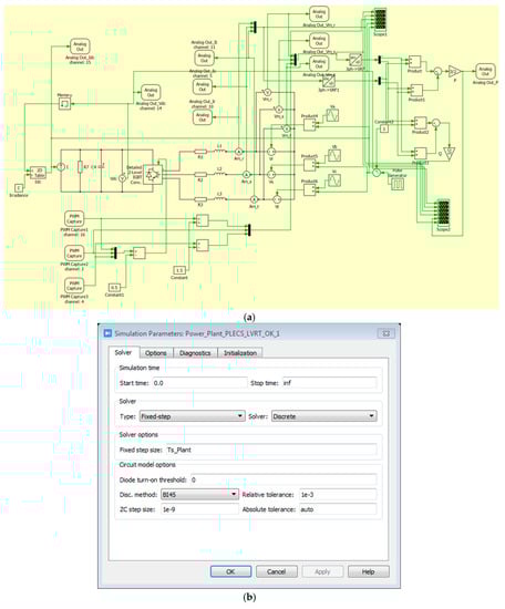 (a) PLECS model of the power subsystem; (b) Simulation Parameters (fixed-step discrete solver).