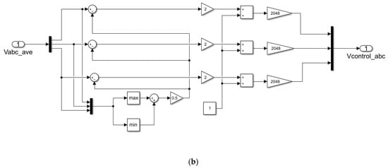 A triggered subsystem can be observed in Figure 10a which indicates that this block will be run a different sample rate than the power subsystem. The whole block will be run at a sample frequency of 24.416 kHz (Treg = 40.957 μs), the same as the switching frequency of the inverter in order to attain the synchronization of the sample process []. The magenta color block computes the MPPT and the non-MPPT algorithms shown in Figure 5 for a specific irradiance and temperature, setting the proper DC bus voltage reference (VDC*).