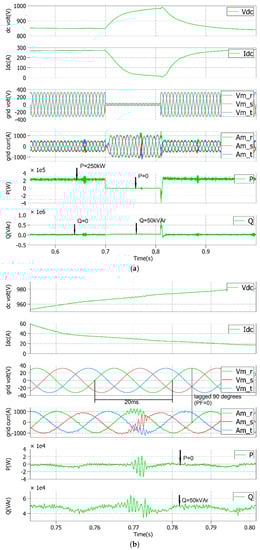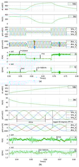 In both tests, the Maximum Power Point (MPP) of the PV generator is tracked when there is no voltage sag and the VDC*MPP DC bus reference voltage is applied to the control algorithm to do the power balance, reaching P a value of 250 kW whereas a zero Q is attained for unity power factor operation. However, the DC link voltage increases during the voltage sag because the limitation in the amplitude of the line currents to its nominal rated value decreases the P delivered to the utility grid and a VDC*non-MPP DC bus reference voltage is set in this situation. At the same time, some amount of Q is needed according to Equation (8) so as to be able to improve the voltage profile of grid voltages during the sags.