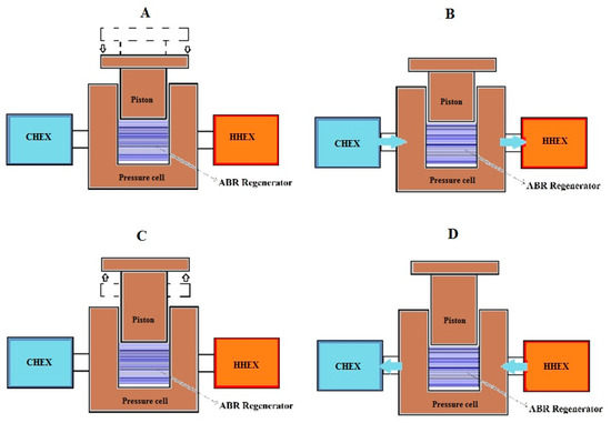 The active caloric regenerative refrigeration cycle applied to barocaloric cooling is defined as the ABR cycle (active barocaloric regenerative refrigeration cycle). As is visible in Figure 1, the ABR cycle is composed of four processes that are repeated cyclically in a refrigeration system: