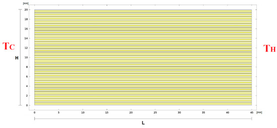 Figure 2 shows the geometry of the model. The HTF flows along the x-axis in both directions. On the left side, by means of a first-type boundary condition, the presence of CHEX (with TC as the set point temperature) is modeled; the same is done on the right side, where TH is the first-type condition associated with HHEX.