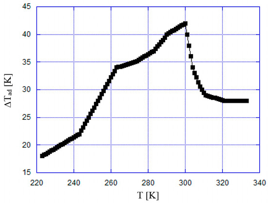 We ultimately chose a barocaloric refrigerant with natural materials and elastomeric properties: acetoxy silicone rubber (ASR) [70]. Polydimethylsiloxane, additive, preserving agents and fillers are the components forming ASR, the latter exhibits a super-giant barocaloric effect with a peak of adiabatic change of temperature falling in correspondence of the crystalline–amorphous transitions with the consequence of polymer chains rearrangements. The adiabatic temperature change detected in acetoxy silicone rubber for decompression (∆p = 0.390 GPa) is shown in Figure 3.