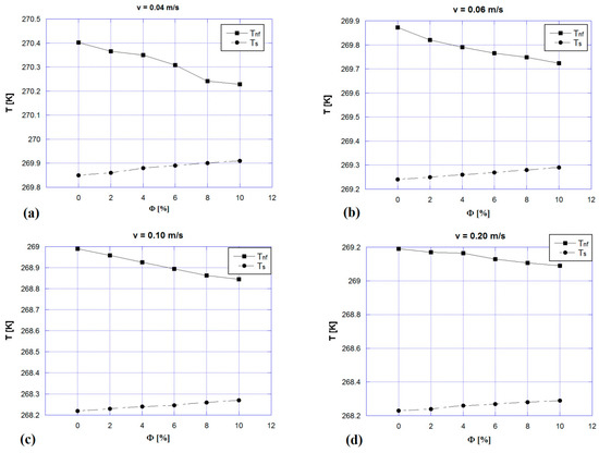 Figure 5 reports the mean temperature values of the boundaries of the channel (made of barocaloric material) and of the nanofluid flowing during the fourth step of the ABR cycle as a function of volume fraction and for a number of nanofluid velocities: (a) 0.04 m/s; (b) 0.06 m/s; (c) 0.10 m/s; (d) 0.20 m/s. From the figures, one can appreciate that the temperature difference between solid and nanofluid was reduced as nanoparticle volume fraction increased. This indicated that the heat exchange was improved following augmentation of . Furthermore, one can notice that increased fluid velocity caused a better exchange with the solid, and as a consequence, the fluid had a lower mean temperature, whereas the solid had a higher one. Figure 5c represents an exception, because the fluid temperature was slightly lower than the fluid with a velocity of 0.20 m/s (Figure 5d).