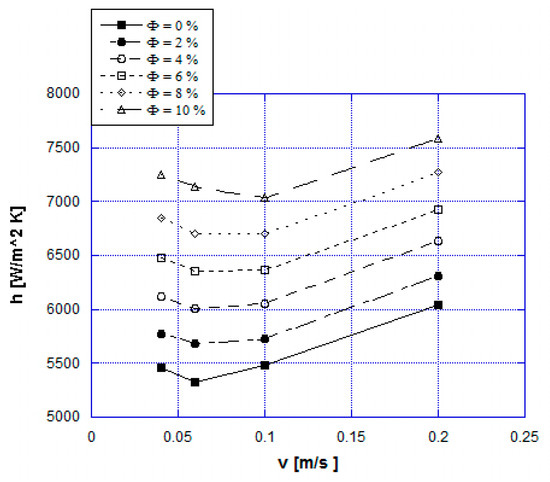 Figure 6 reports the convective heat transfer coefficient as a function of nanofluid velocity parametrized for nanoparticle volume fraction. By fixing the velocity, one can appreciate the enhancement of the heat transfer coefficient with increasing nanoparticle volume fraction. A maximum h-enhancement of +34% was registered if the nanoparticles concentration increased from 0% up to 10% with v = 0.06 m/s, and +30% of heat transfer improvement for nanoparticles concentration increased from 0 to 10% was estimated as the mean value with respect to the nanofluid velocity. Moreover, one can notice that each curve plotted in Figure 6 had minimum points located at v = 0.06 m/s for low ϕ and at v = 0.10 m/s when the nanoparticles concentration increased. We found an explanation for this trend by analyzing each contribution of the nanofluid energy equation: