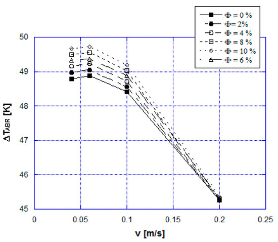 is a parameter used to evaluate the maximum temperature drop across the ABR since it measures the temperature difference between the nanofluid exiting the regenerator at the hot side (x = L) during the cold-to-hot flowing phase and at the cold side (x = 0) during the hot-to-cold flowing phase. To this hope, Figure 8 reports the trends of as a function of nanofluid velocity parametrized for nanoparticles volume fraction. As a general trend, it was possible to observe that there was a maximum of , located at v = 0.06 m/s for each volume fraction. At a fixed volume fraction, the first increased with fluid velocity, where it reached a maximum and then decreased. Indeed, by increasing the fluid velocity, the convective heat transfer coefficient also increased, as shown in Figure 6. Therefore, there was an optimal fluid velocity (around 0.06 m/s) corresponding to the point where the fluid could utilize the entire energy available from the barocaloric effect, and it was independent from the particles volume fraction. Further fluid flow perturbed the temperature profile of the ABR, reducing the temperature difference between the fluid and the regenerator. The latter quickly became overwhelmed by the fluid flow, and the efficiency of the heat transfer decreased. Figure 8 also shows that, at fixed fluid velocity, the increased by augmenting the particles volume fraction. Therefore, working with nanofluids had a positive influence on the convective barocaloric-refrigerant-auxiliary-fluid heat exchange. With increasing nanofluid velocity, the nanoparticle concentration had a lower influence on the augmentation , because the efficiency of the heat exchange decreased. Therefore, at v = 0.2 m/s, the points appeared closer to each other than had occurred at lower velocities.